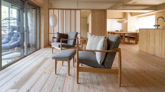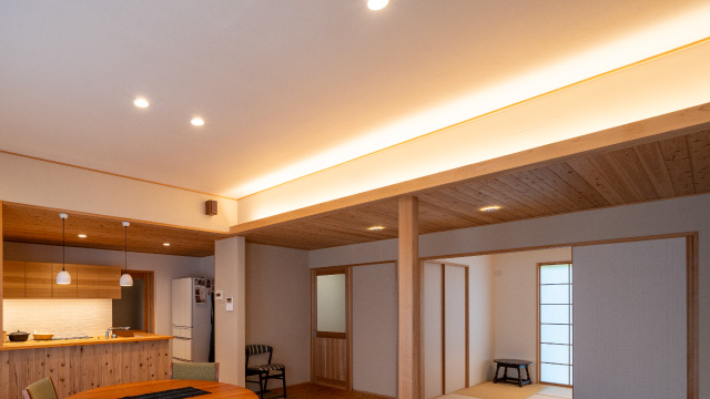 木の家の心地よさを最大限に引き出すため、私たちは照明にもこだわります。天井や壁に美しく反射する柔らかな光が、空間全体に奥行きと広がりをもたらします。