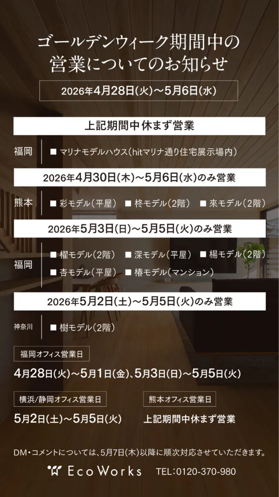 平素は格別のご高配を賜り、厚く御礼申し上げます。弊社モデルハウスは、GW期間中【2026年4月28日(火)~2026年5月6日(水)】下記のとおり営業いたします。